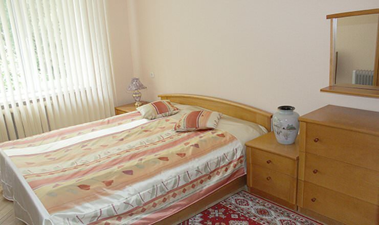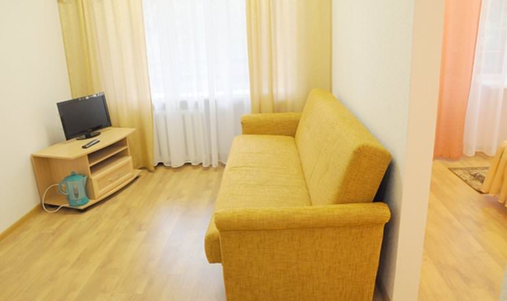 Площадь номера - 35-43 кв.м. 2 комнаты. 2 осн. места. В номере: телевизор; холодильник; душ; электрочайник; 1-спальные/ 2-спальная кровать; диван; журнальный столик; тумбочки; шкаф; чайный набор. 1 доп. место: